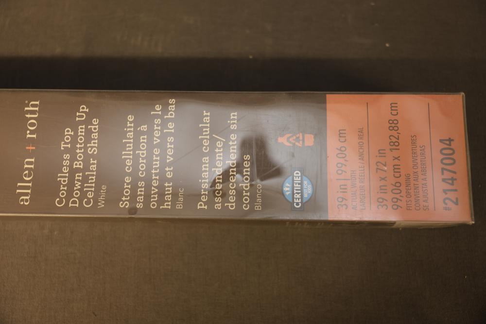 Allen + Roth Cordless Top Down Bottom Up Cellular Shades, 39 x 72 In. These window treatments provide privacy and light control with a durable cellular construction in a white finish. Includes two sets. Pickup only.