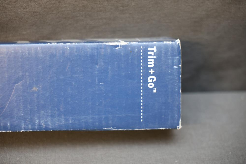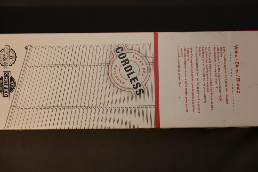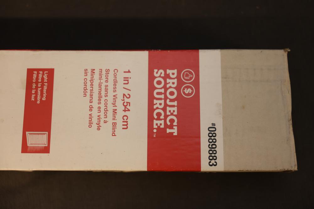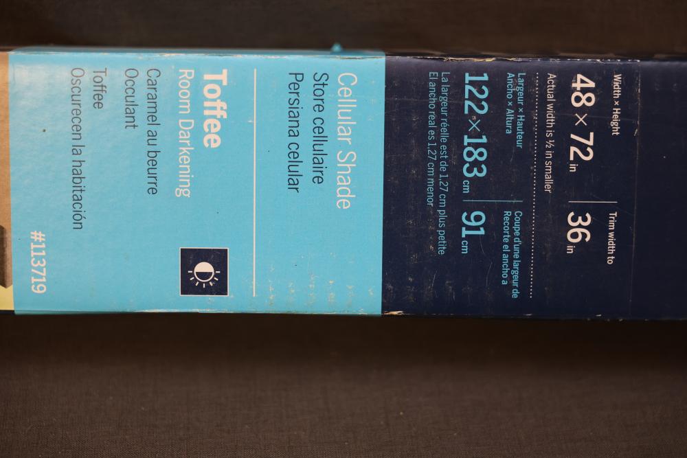 Levolor Trim+Go Cellular Shade in Toffee color, room darkening, measuring 48 x 72 inches with a trim width of 36 inches. Includes Project Source Cordless Vinyl Mini Blind in white, sized for a 23 x 72-inch opening with an actual width of 22.5 inches. Both items are new in original packaging. Pickup only.