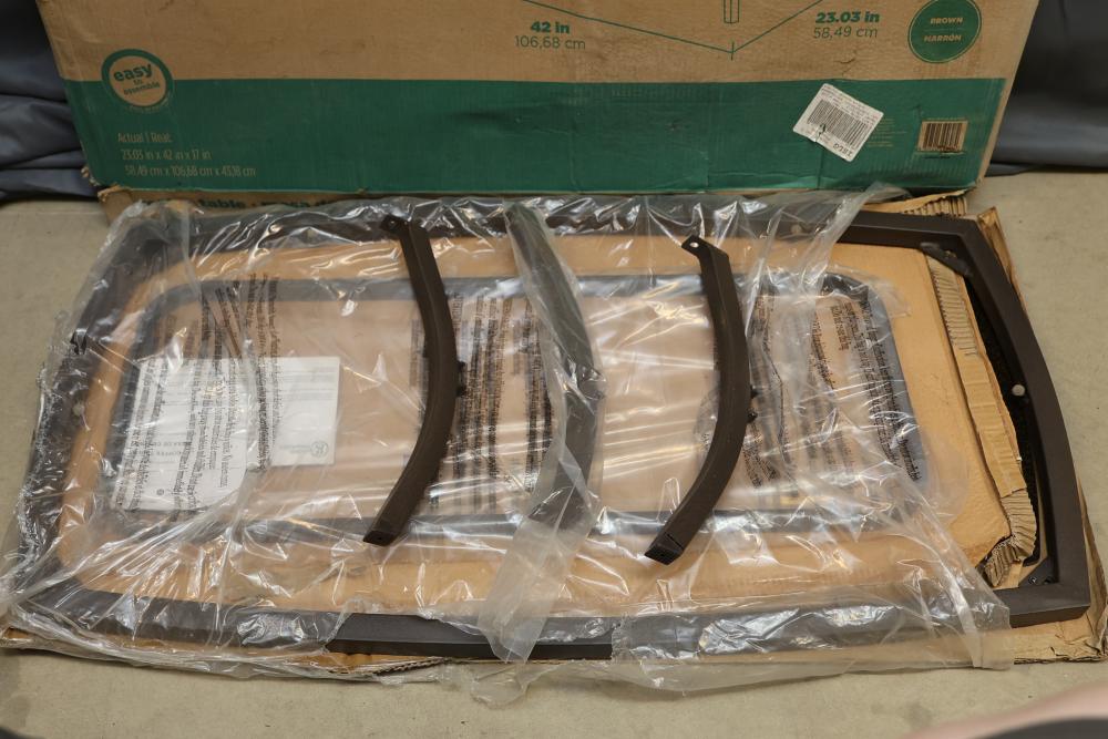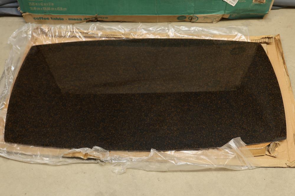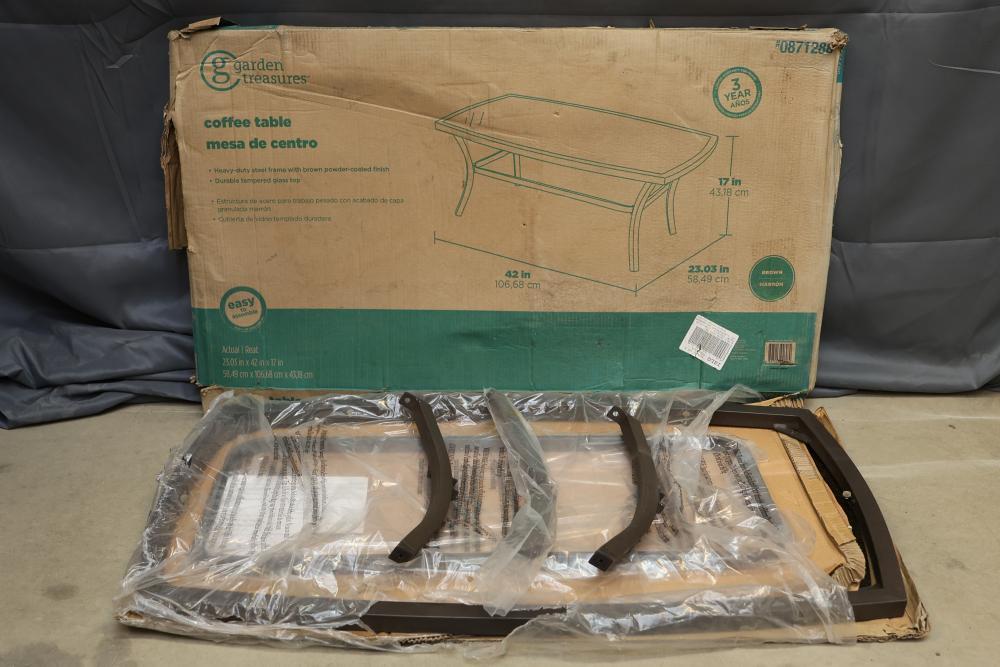Garden Treasures Coffee Table with Glass Top and Metal Frame. Measures 23.03 in x 42 in x 17 in (58.49 cm x 106.68 cm x 43.18 cm). Easy to assemble. Box shows signs of wear, but the contents appear unused and are still in original packaging. Pickup only.
