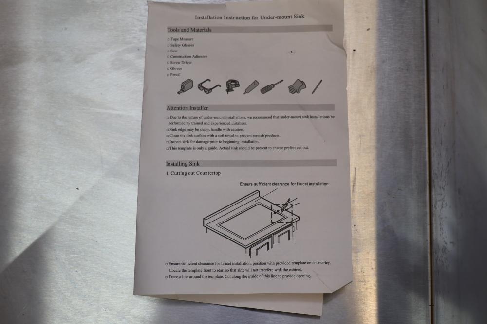 Stainless Steel Undermount Kitchen Sink with Accessories. Includes installation instructions, mounting hardware, and additional component box. The sink appears to be unused but comes in an opened and slightly damaged box. Model No: AS114ST, PID: KS0073. Pickup only.
