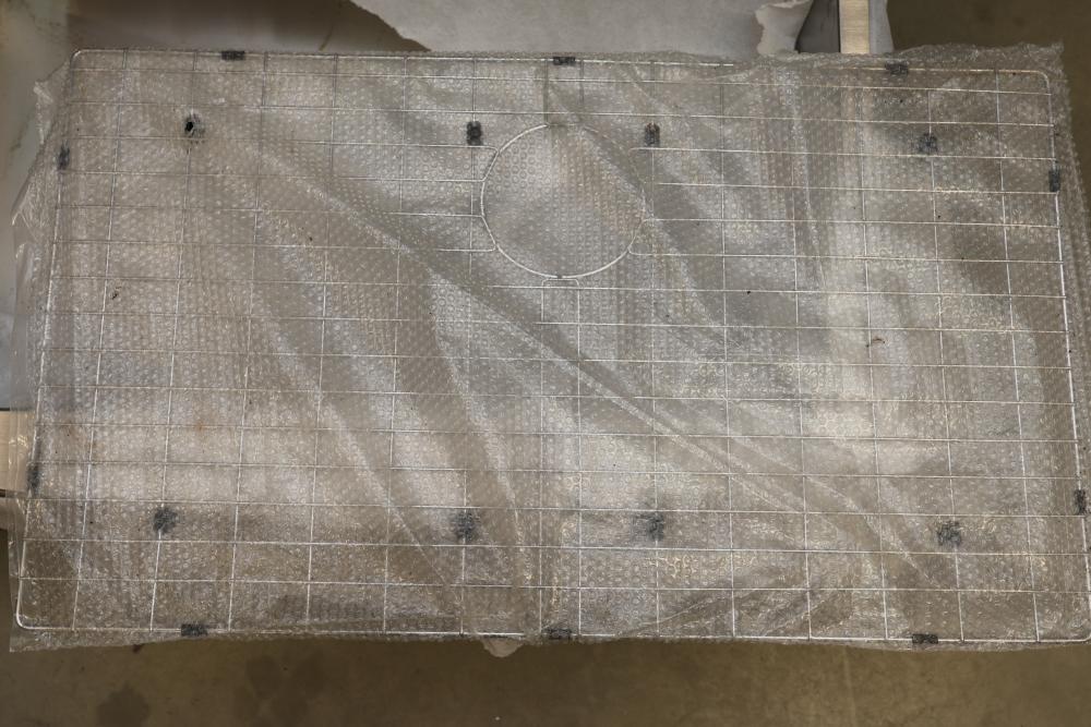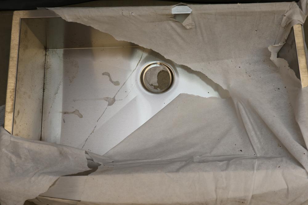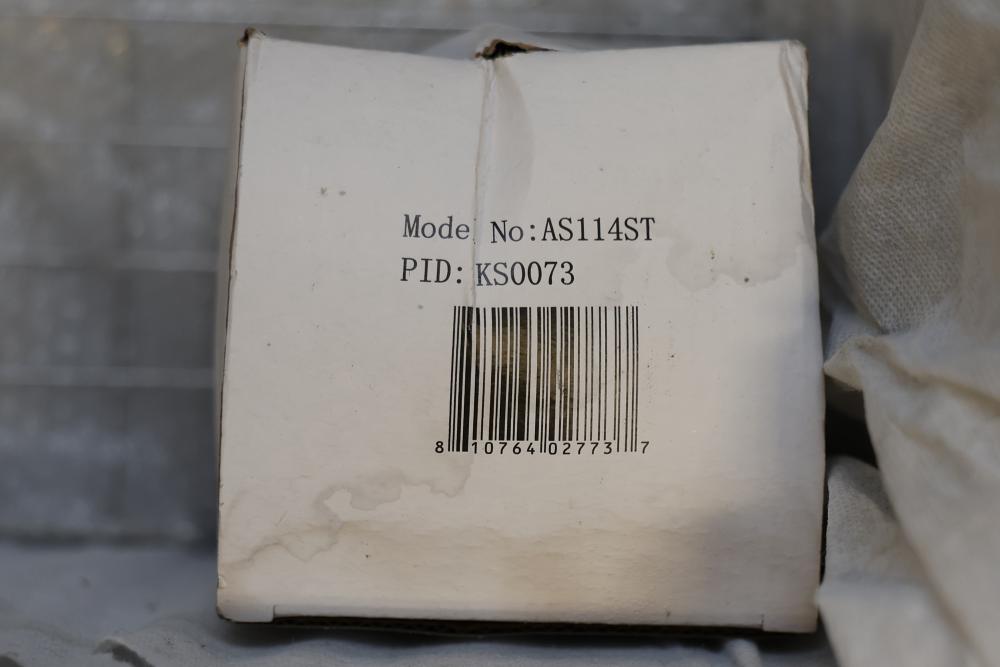 Stainless Steel Sink Basin With Accessories. Includes a stainless steel basin, protective grid, and drain cover. Model No: AS114ST and PID: KS0073. Some packaging remains on the item. The item appears unused and includes the original barcode on the packaging. Pickup only.