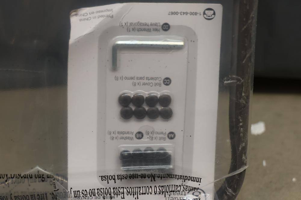 Garden Treasures Coffee Table with Glass Top and Hardware. Includes a glass tabletop, metal frame, and assembly hardware. The item is new and comes in original packaging, though the box shows some wear. Features a one-year limited warranty as indicated on the packaging. Pickup only.