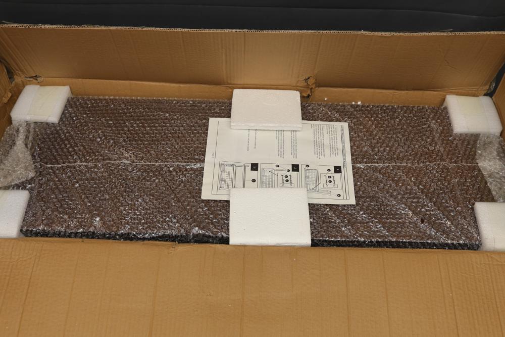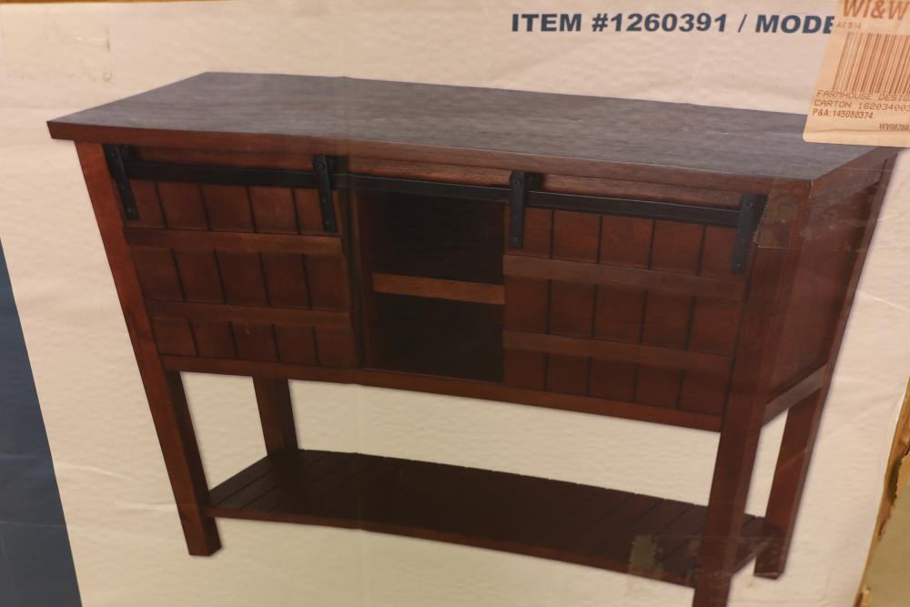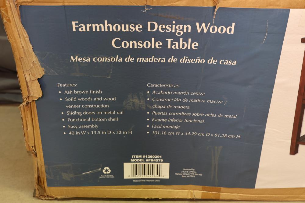 Farmhouse Design Wood Console Table with Ash Brown Finish. Constructed of wood featuring sliding doors on a metal rail, functional bottom shelf, and easy assembly. Dimensions are 40 inches wide by 13.38 inches deep by 32 inches high. New in open box. Pickup only.