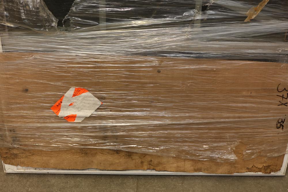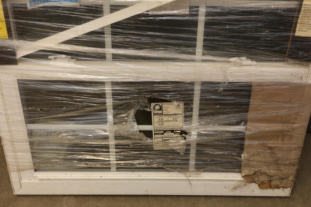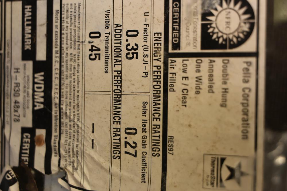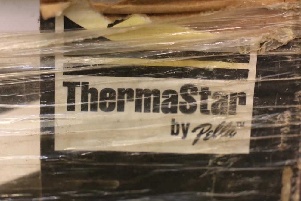ThermaStar by Pella double-hung annealed window with one wide low-E/clear glass, certified for energy performance. Includes specific ratings for U-Factor (0.35), Solar Heat Gain Coefficient (0.27), and Visible Transmittance (0.45). The item is wrapped in plastic and exhibits visible damage, including a broken section. Pickup only.