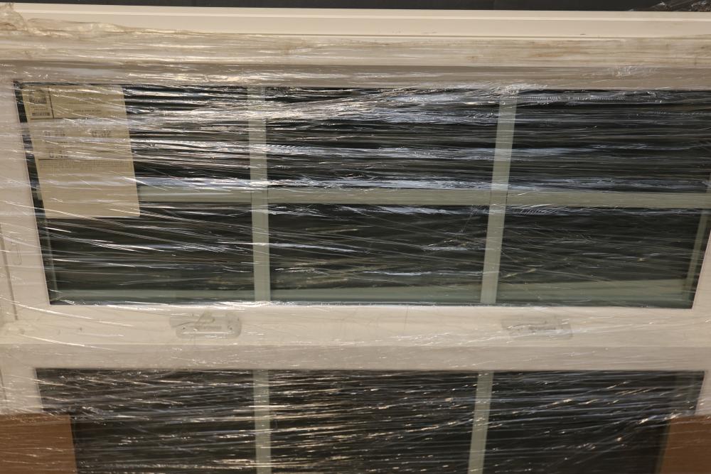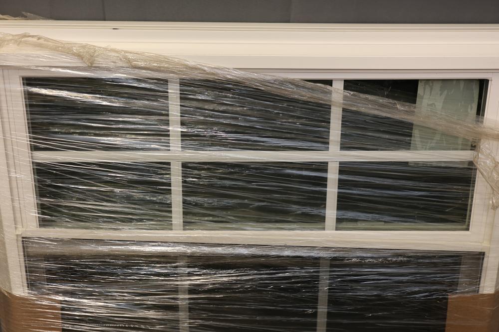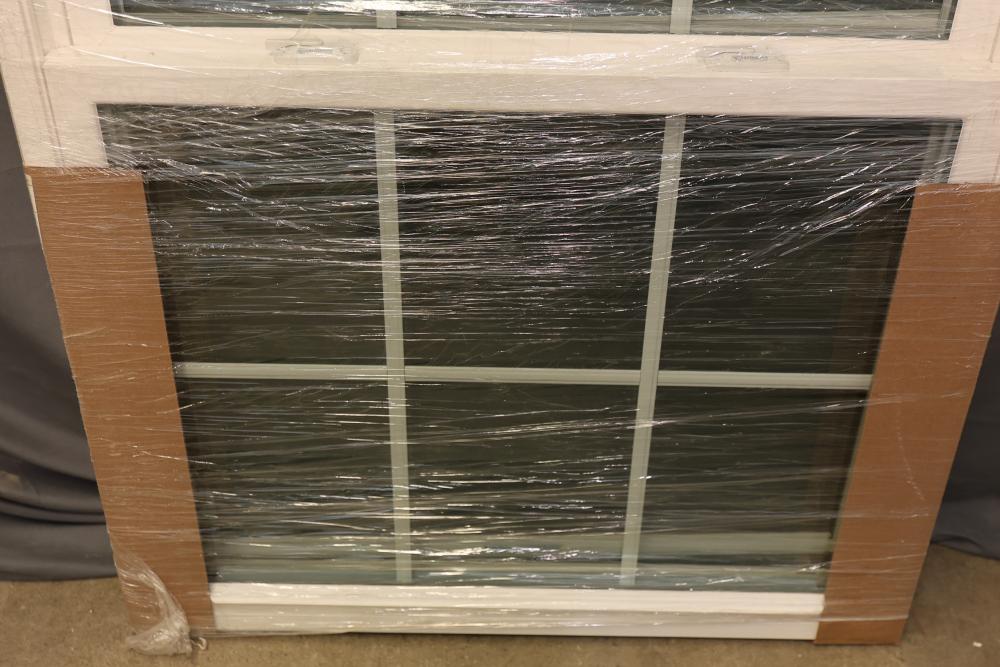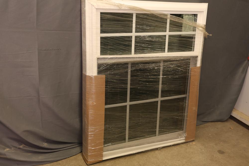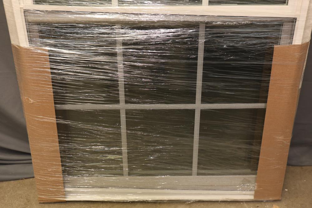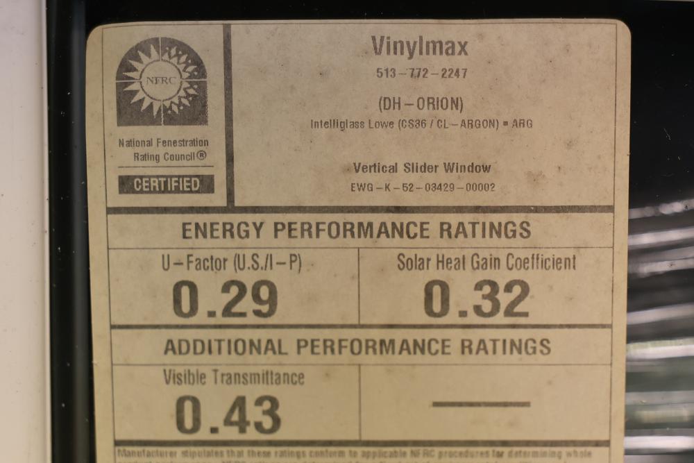 Vinylmax Vertical Slider Window with Grid Design. Features a six-over-six grid pattern with an energy-efficient build. Certified energy ratings include a U-Factor of 0.29, Solar Heat Gain Coefficient of 0.32, and Visible Transmittance of 0.43. Pickup only.