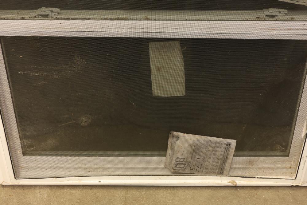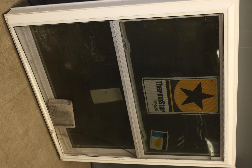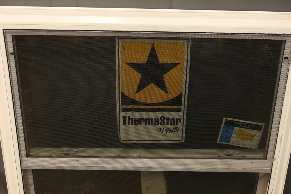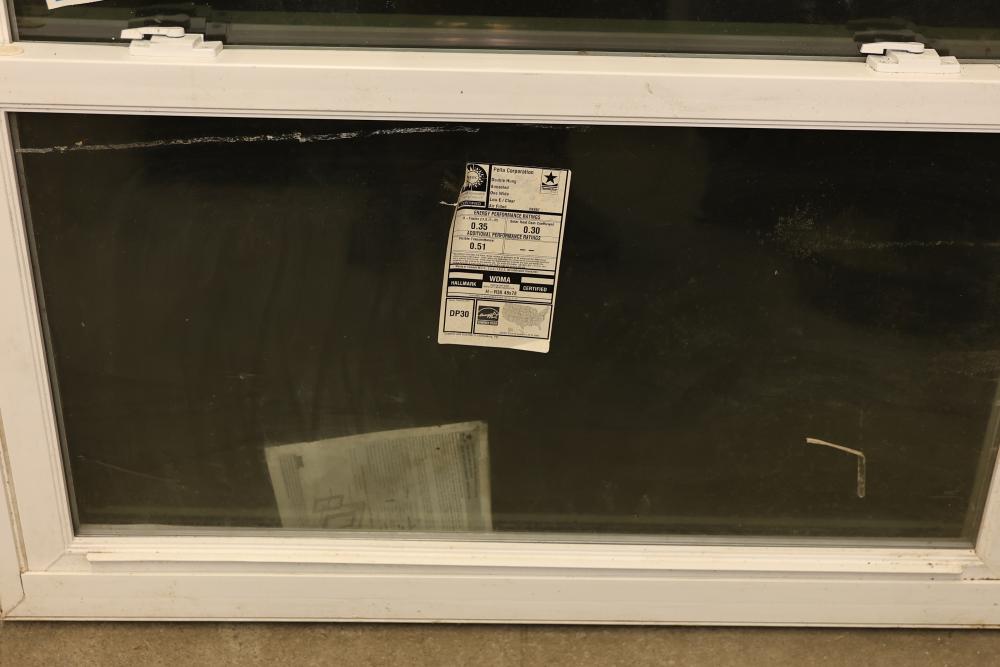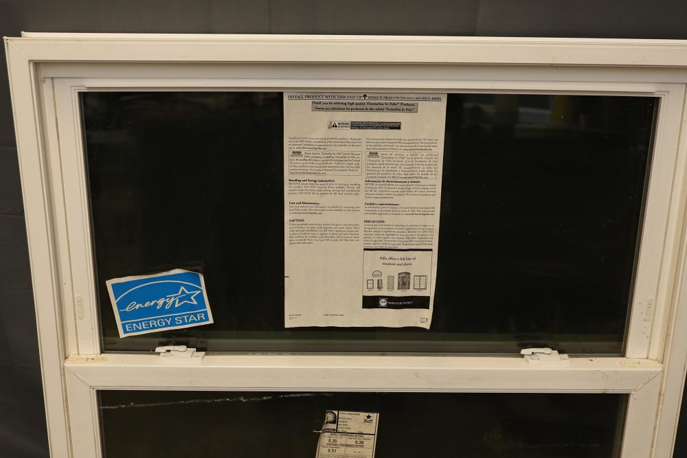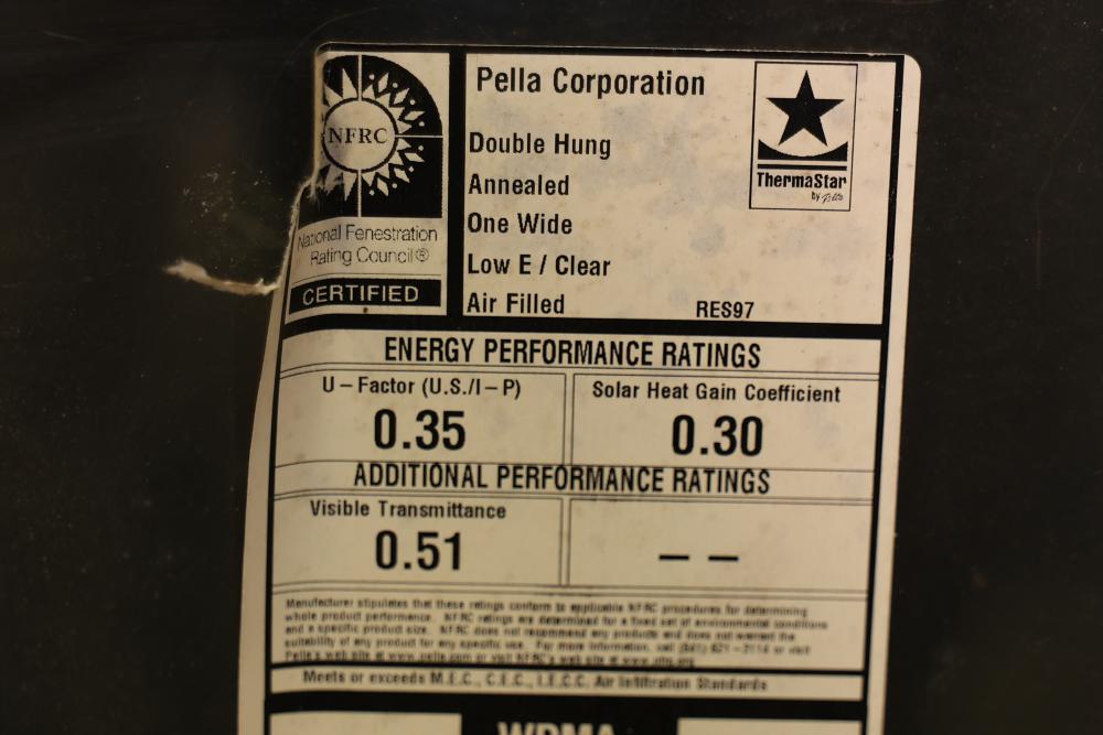 Pella Thermastar Double Hung Window with Energy Star Certification. The window features annealed glass with low E/clear coating, air-filled, and comes with energy performance ratings including a U-Factor of 0.35 and Solar Heat Gain Coefficient of 0.30. Includes attached labels with specifications. Some surface wear is visible. Pickup only.