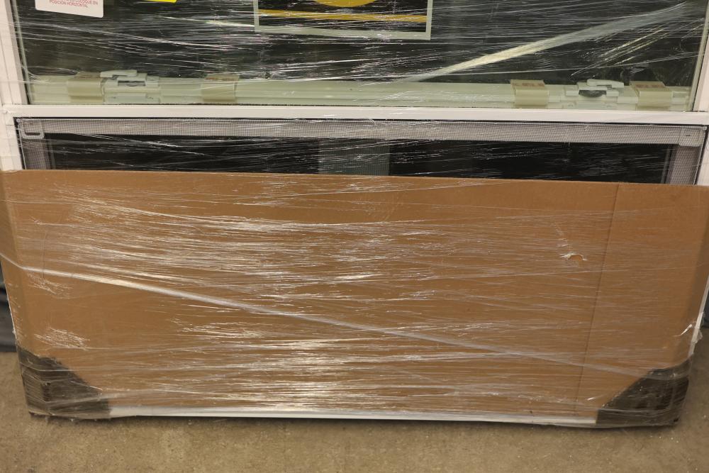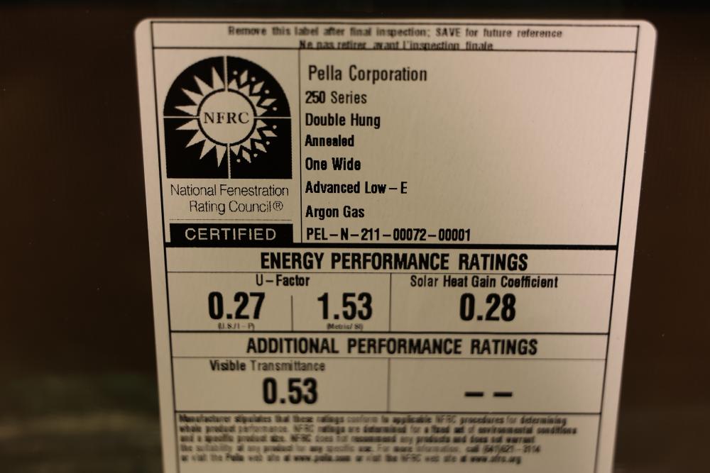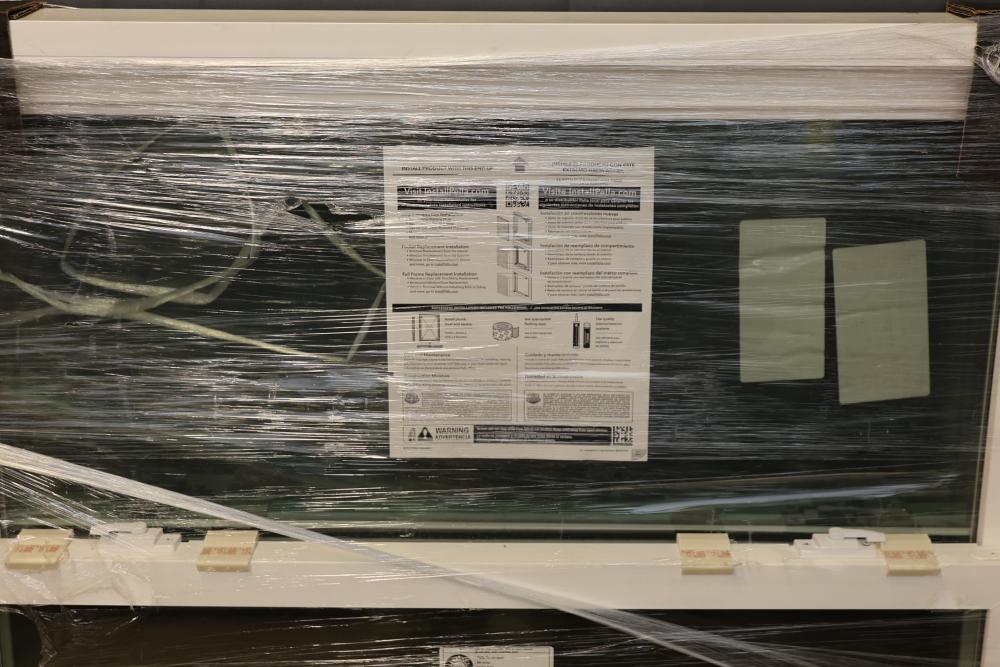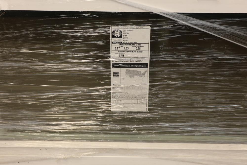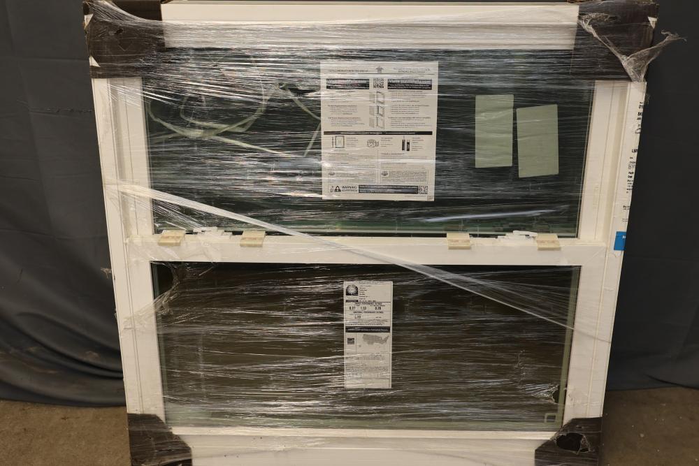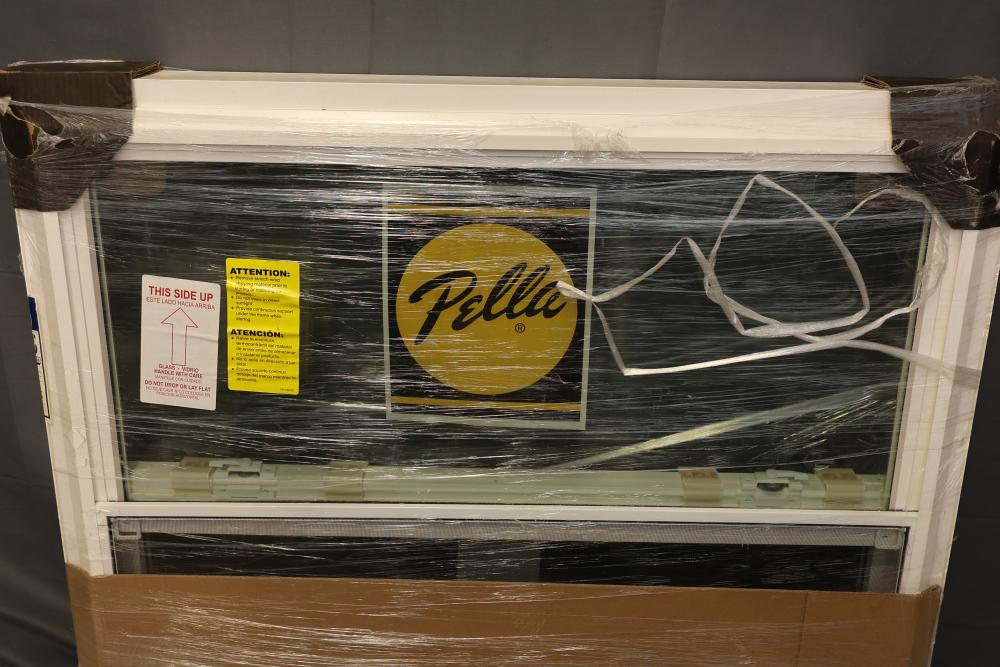 Pella Double-Hung Window, 250 Series, featuring a white frame and advanced Low-E argon gas-filled glass. The unit is designed for energy efficiency with a U-Factor of 0.27 and a Solar Heat Gain Coefficient of 0.28. Wrapped in protective packaging and includes manufacturer labels and instructions. Pickup only.