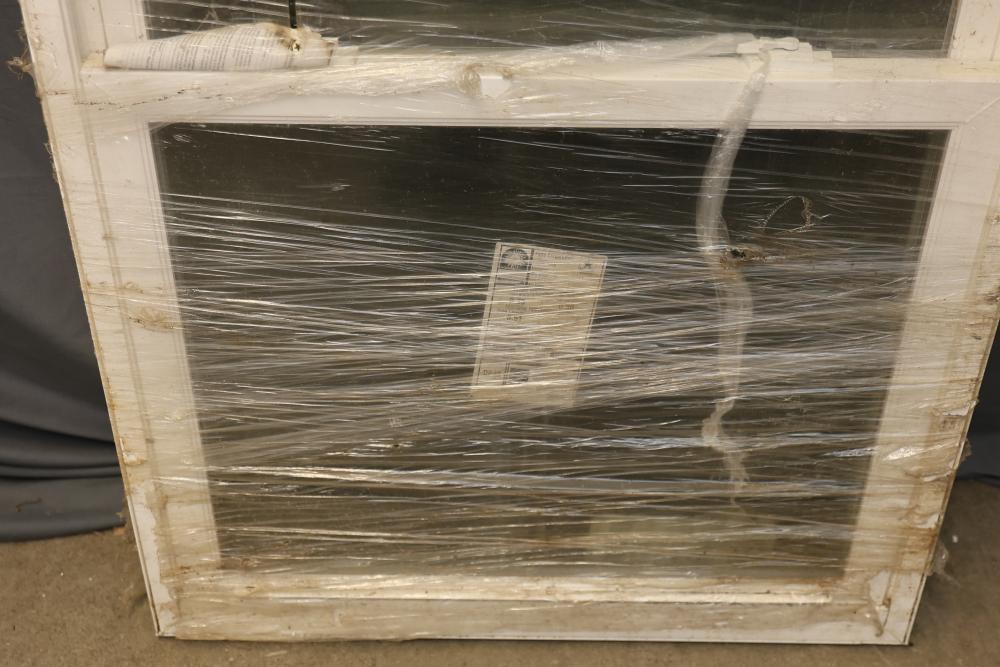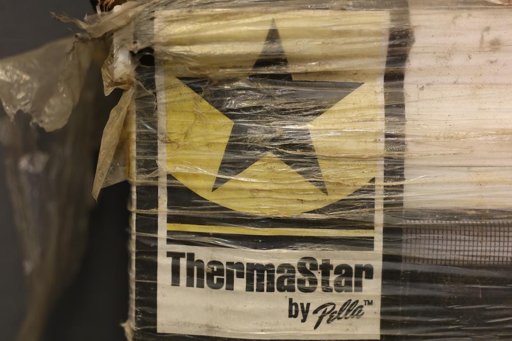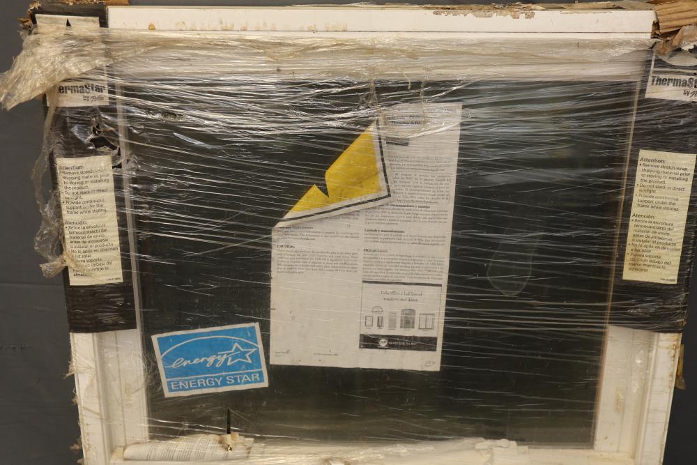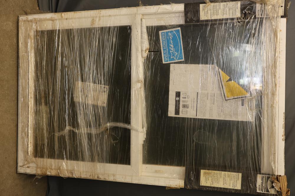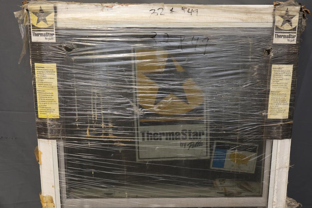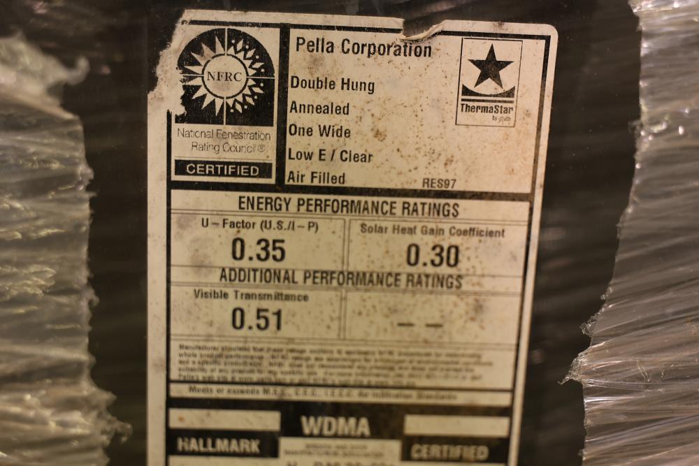 ThermaStar by Pella double-hung window featuring Low E clear glass and an air-filled construction. Certified by the National Fenestration Rating Council with performance details such as U-Factor 0.35 and SHGC 0.30. Exterior dimensions measure 32 x 48 inches. Pickup only.