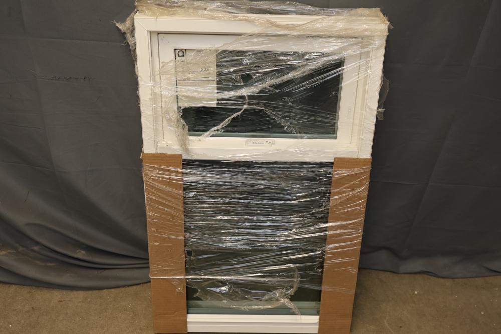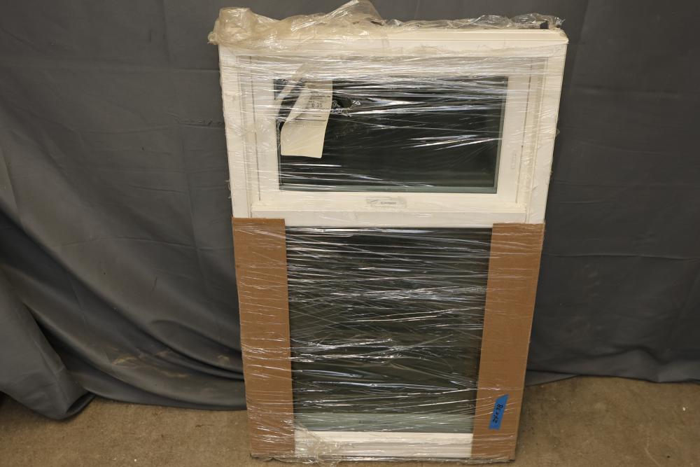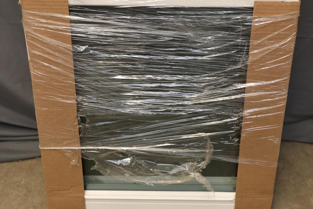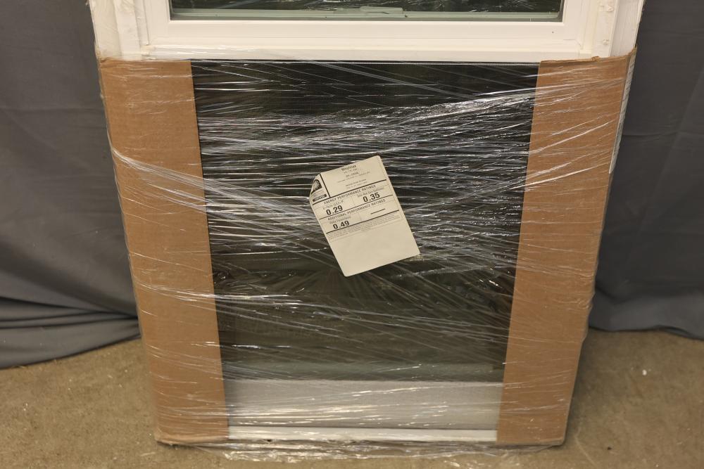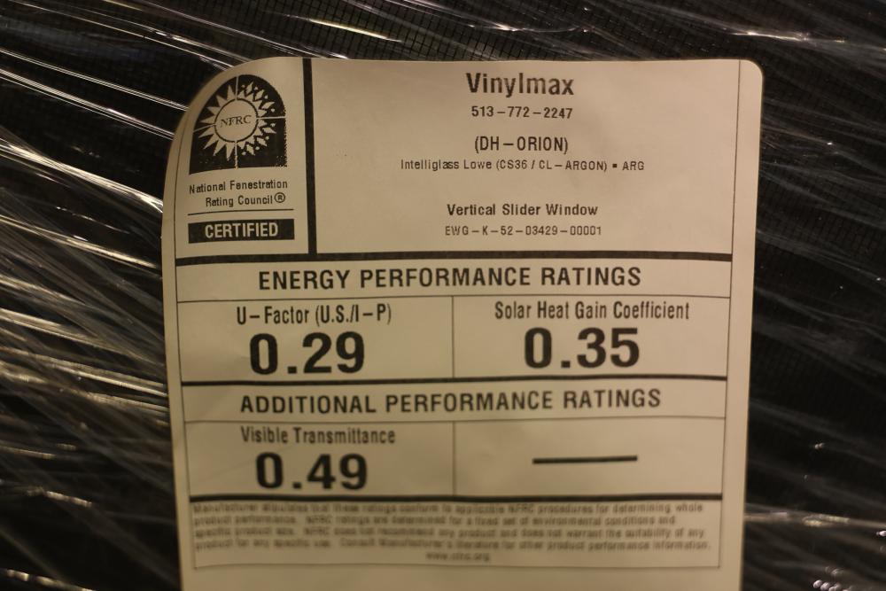 Set of 2 Vinylmax vertical slider windows measuring 24 x 38 inches. Constructed with energy-efficient features, including a U-Factor rating of 0.29 and Solar Heat Gain Coefficient of 0.35, as indicated on the label. The item is wrapped in protective packaging. Pickup only.