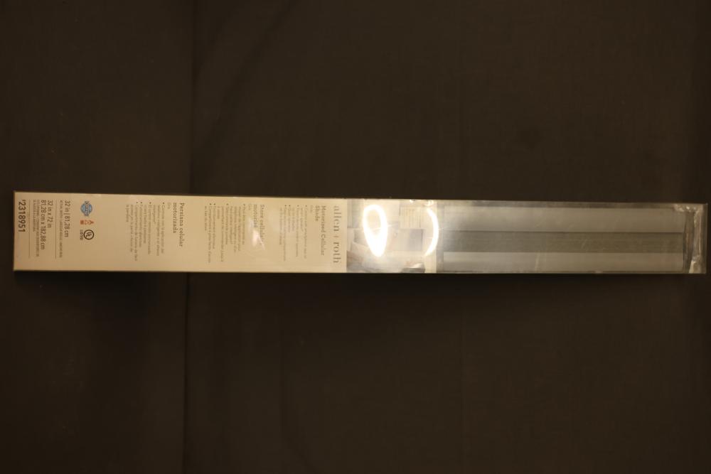Allen + Roth Motorized Cellular Shades 31x72 Inches in Gray. Features smart phone app and remote control compatibility, energy-efficient battery operation, and silent performance. Dimensions: 31 inches in width and 72 inches in height. Pickup only.
