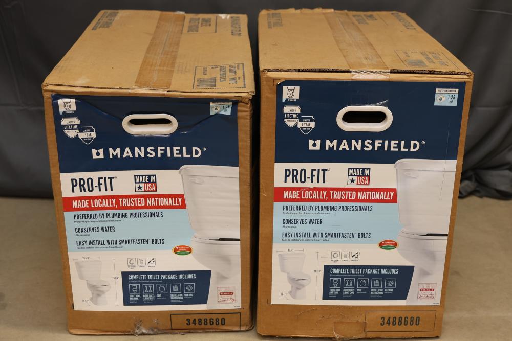 Mansfield Pro-Fit and Alto Tank toilet packages including all necessary components for installation. Items include toilet bowls, tanks, floor bolts, bolt caps, seats, wax rings, and installation instructions. Units are designed for high efficiency at 1.28 GPF / 4.8 LPF with SmartFasten tank-to-bowl connection. Part numbers include L51350017 and 317310000. Pickup only.