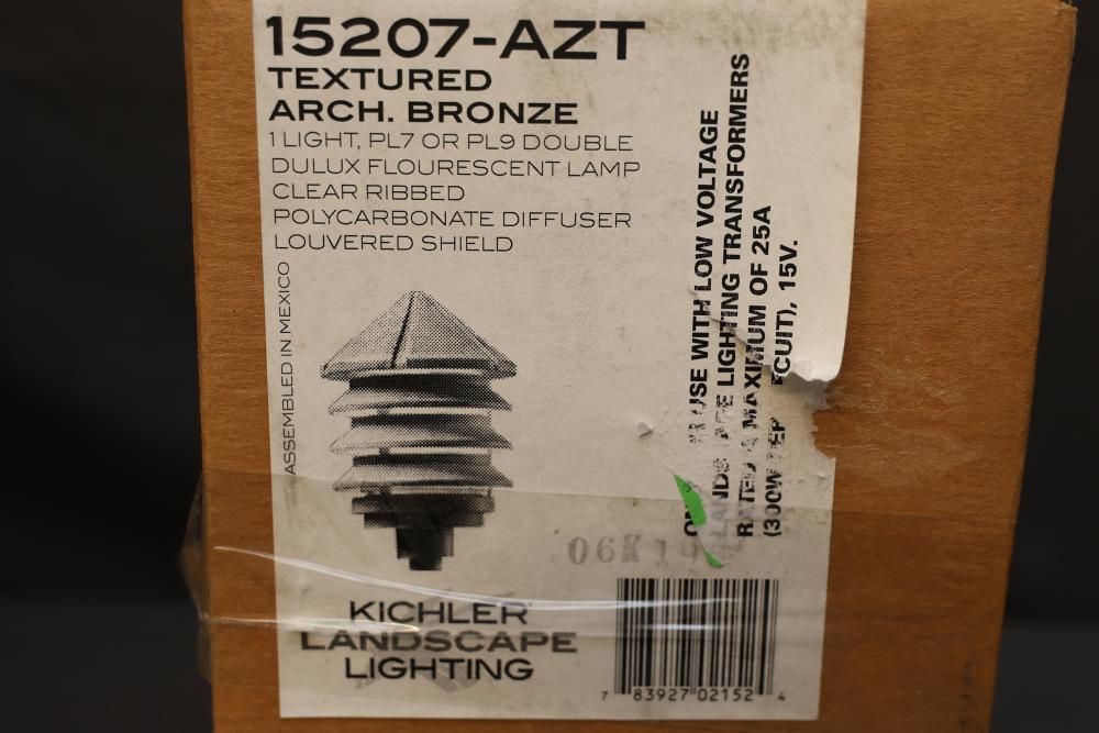 Kichler Landscape Lighting Fixtures in Textured Arch Bronze and Textured Midnight Spruce. Includes one 15207-AZT Textured Arch Bronze light and one 15005-MST Textured Midnight Spruce light. Both are for use with low voltage lighting transformers and require appropriate bulbs. Includes components, instructions, and packaging as shown.