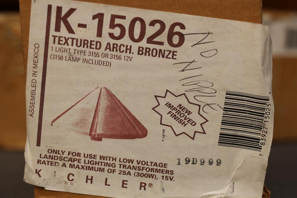 K-15026 Textured Arch Bronze Low Voltage Light Fixtures. Includes four boxed units, each designed for use with low voltage landscape transformers with a maximum of 25A (300W, 15V). Compatible with 3155 or 3156 12V lamps, with one 3156 lamp included in each box.