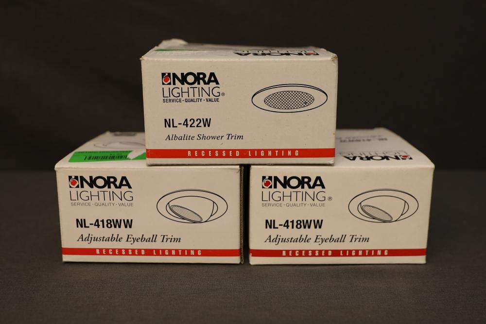 Nora Lighting Recessed Trim, Models NL-418WW and NL-422W. Includes adjustable eyeball trim and albalite shower trim designed for recessed lighting installations. Units appear in original packaging. Pickup only.