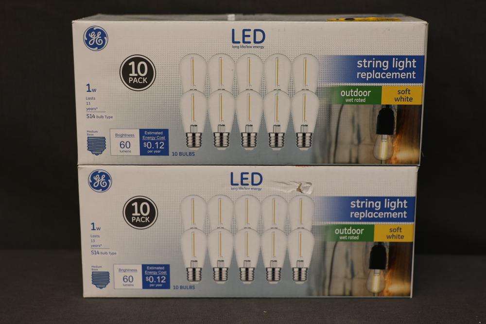 GE LED String Light Replacement Bulbs, 1W, Soft White, 3 Boxes (30 Bulbs Total). Each box contains 10 bulbs designed for use with string light sets. Bulbs emit 60 lumens with a warm light appearance of 2700K. Rated for outdoor use and designed to last up to 13.7 years based on average use. Pickup only.