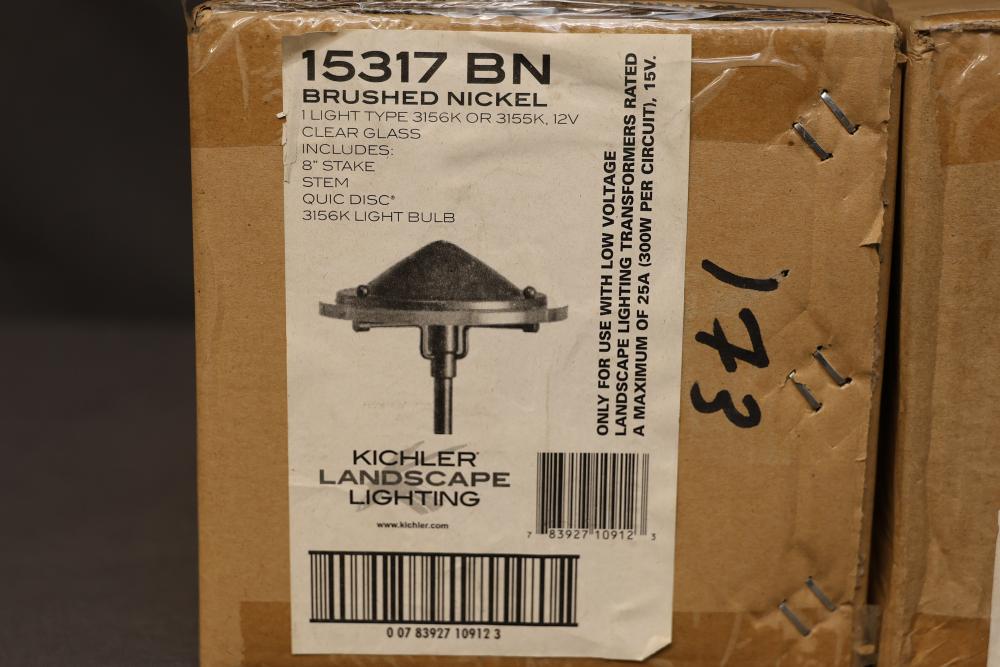Kichler Brushed Nickel Landscape Lighting Fixtures. Includes two 15317 BN fixtures with clear glass shades, stems, and stakes. Designed for low-voltage use with 12V circuits, each fixture supports a 3156K light bulb. New in box with assembly instructions included.