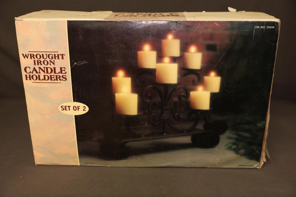 Two Wrought Iron Candle Holders with Scroll Design. Designed to hold multiple candles, each piece features a sturdy base and intricate scrollwork details. Pickup only.