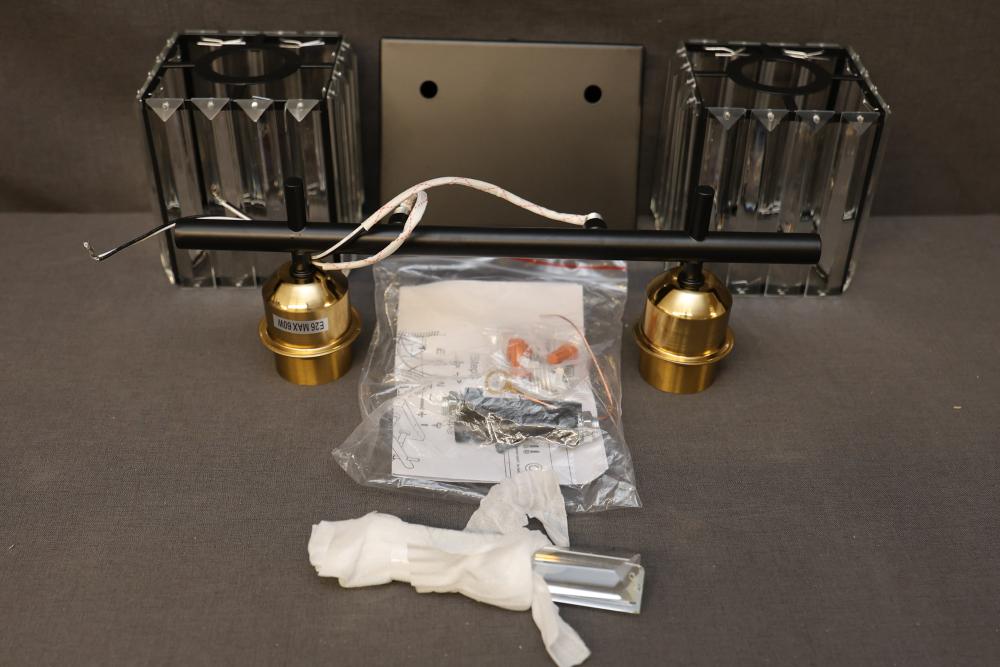 Two-Light Wall Sconce with Glass Shades and Installation Kit. This item includes two brass-tone light fixtures mounted on a black bar, two crystal-like glass shades with prismatic design, a wall mounting plate, and an installation kit containing screws, wiring, and connectors. Pickup only.