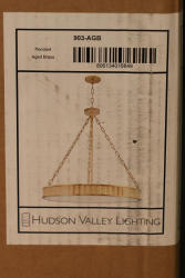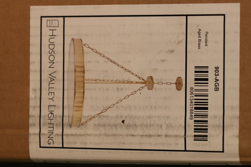 Hudson Valley Lighting Pendant Model 903-AGB in aged brass finish. The fixture includes a round metal frame, chains, wiring, and a white glass shade. Packaged in its original box, it is suitable for ceiling installation. Pickup only.