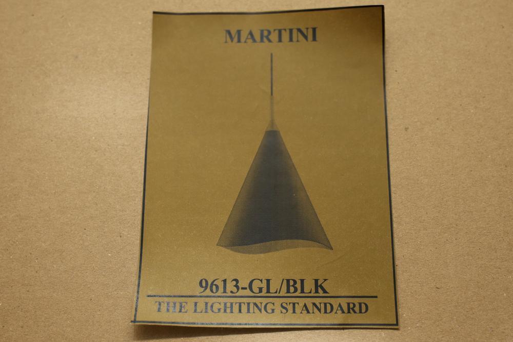 Martini 9613-GL/BLK Pendant Lighting Fixture includes a black finish with gold-tone accents. Item comes with wiring, mounting hardware, and installation instructions. Designed for hardwiring, it features a conical black shade with a metallic interior for reflective lighting. Pickup only.