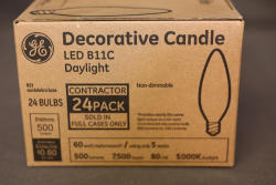 GE Decorative Candle LED B11C Bulbs, 24-Pack, Non-Dimmable. Includes a total of 24 bulbs per box, with four boxes included. Bulbs are 60 watts equivalent, use 5 watts, and emit 500 lumens. They feature a candelabra base and have a daylight color temperature of 5000K and a soft white option at 2700K. Rated lifespan of 7500 hours. Pickup only.