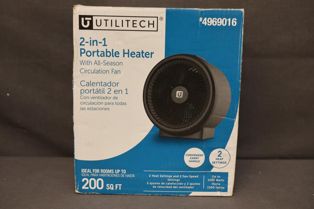 Utilitech 2-in-1 Portable Heater With All-Season Circulation Fan, model NF15-18U. Designed for spaces up to 200 sq ft; features include 2 heat settings, fan-only mode, adjustable thermostat, and power indicator light. With a compact and lightweight design, it plugs into standard 120V outlets. Includes original box with visible wear. Pickup only.