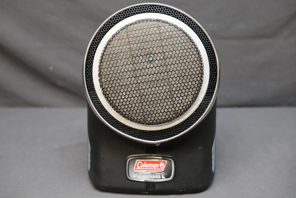Coleman ProCat Portable Catalytic Heater 3,000 BTU/H Model 5053. Features electronic ignition, adjustable flame control, and operation instructions on the unit. Designed for portable heating needs. Unit shows wear on outer casing. Pickup only.
