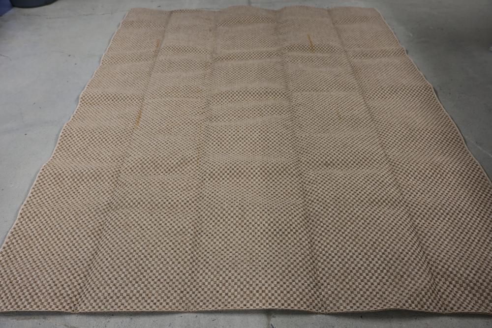 Checkered Patterned Brown Rug with Subtle Design. Features a brown and beige checkered pattern with a woven texture. The rug has some visible signs of wear including a noticeable stain. Dimensions and material details are unspecified. Pickup only.