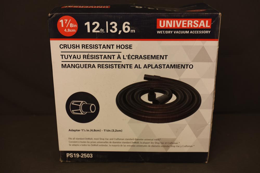 Universal 12 ft Crush Resistant Wet/Dry Vacuum Hose with Adapter. The hose measures 12 feet long and 1-7/8 inches in diameter. Designed as a wet/dry vacuum accessory, it includes adapter fittings to connect various compatible vacuum units. In new condition and packaged in the original box. Pickup only.