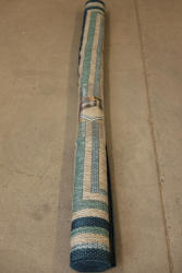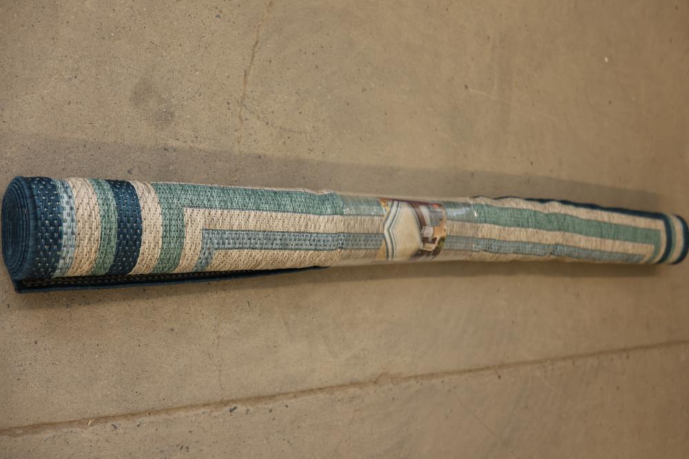 Allen & Roth 8 x 10 Indoor/Outdoor Patio Rug. Features a woven design suitable for indoor and outdoor use. The dimensions are 8 feet by 10 feet, making it ideal for patios or living spaces. The rug showcases striped detailing in shades of green, blue, and beige. Designed for durability in multiple environments. Pickup only.