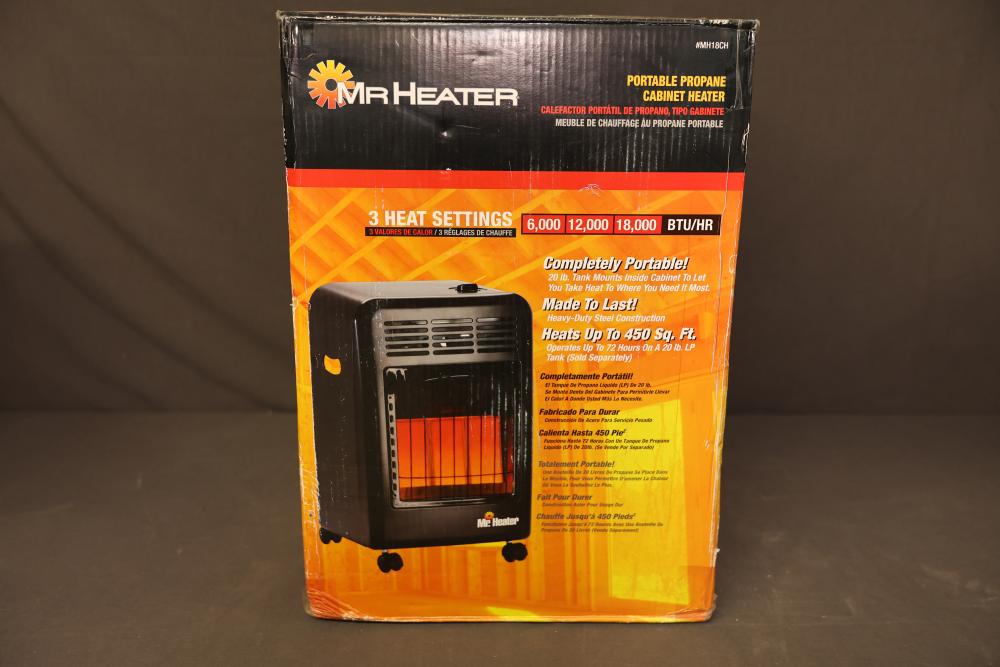 Mr. Heater Portable Propane Cabinet Heater with 3 heat settings (6,000, 12,000, 18,000 BTU/HR). Designed for heating up to 450 sq. ft. Features a durable black casing, built-in wheels for mobility, and a top control knob for heat adjustment. Includes operating instructions and owner’s manual. Requires propane gas for operation. Pickup only.
