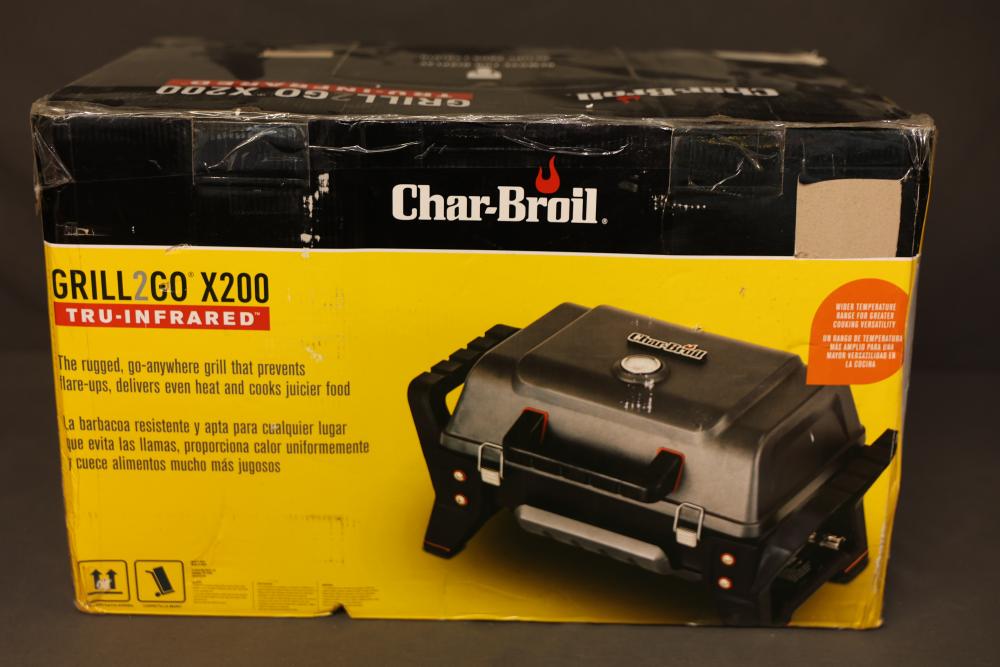 Char-Broil Grill2Go X200 Tru-Infrared Portable Gas Grill. Features a durable, compact design with a high-impact frame and built-in handles for portability. Includes a lid-mounted temperature gauge, TRU-Infrared cooking system for even heat distribution, and stainless steel grates. Comes in original packaging with accessories and instructions. Pickup only.