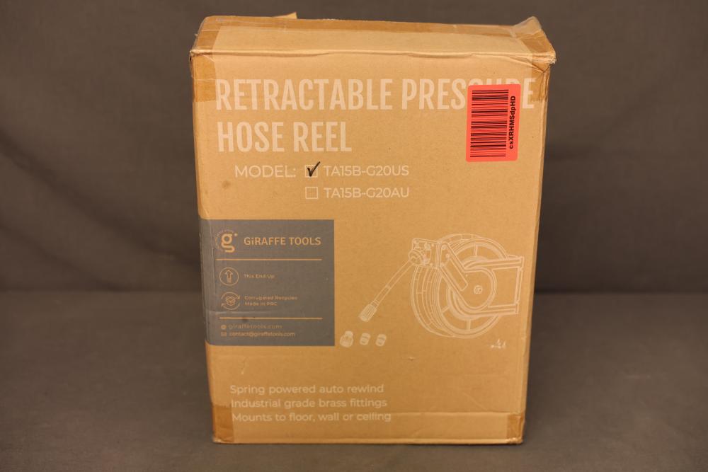 Giraffe Tools Retractable Pressure Hose Reel Model TA15B-G20US. Includes mounting hardware, brass fittings, and instruction manual. Features a spring-powered auto-rewind mechanism, industrial-grade steel reel, and pressure hose. Shows signs of light wear on the edges. Pickup only.