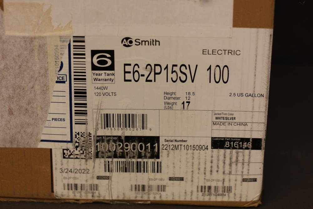 AO Smith E6-2P15SV Electric Storage Tank Water Heater 2.5 Gallon. Features include a nominal capacity of 2.5 gallons, 1440W power, and 120V operating voltage. Tested up to 300 PSI with a maximum working pressure of 150 lbs. Includes accessories and user manual. Pickup only.