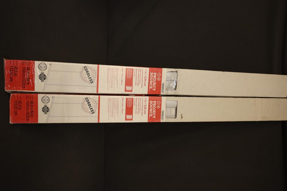 Project Source 1-Inch Cordless Vinyl Mini Blinds, 46 x 64 Inches, White. Designed with a light-filtering feature and child-safe cordless operation. Dimensions are 46 inches by 64 inches (116.84 cm by 162.56 cm). Suitable for windows requiring a clean and functional covering solution. Pickup only.