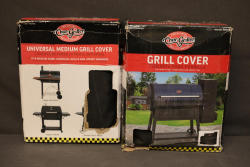 Char-Griller Universal Medium Grill Covers designed to fit medium-sized charcoal grills and offset smokers. Includes two covers as shown in original packaging. Covers are in black and feature durable material for outdoor use. Pickup only.