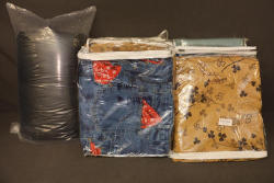 Full-Size Bedding Ensembles in Various Designs. Includes multiple sets of full-size bedding with varying patterns and colors, still sealed in plastic packaging. Some sets have pricing marked on packaging. Includes floral patterns, solid colors, and other decorative designs. Pickup only.