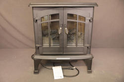 Hampton Bay Electric Stove Heater with Dual Glass Doors and Log Display. Model# EST-534T-10. Features a black housing, realistic log detail, dual doors with glass inserts, adjustable heat settings, and electric operation at 120V AC. Includes a visible control panel and power cord. Measures as seen in the provided images. Pickup only.