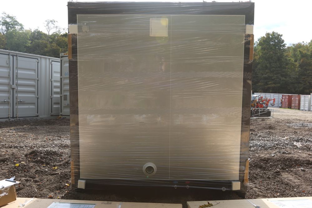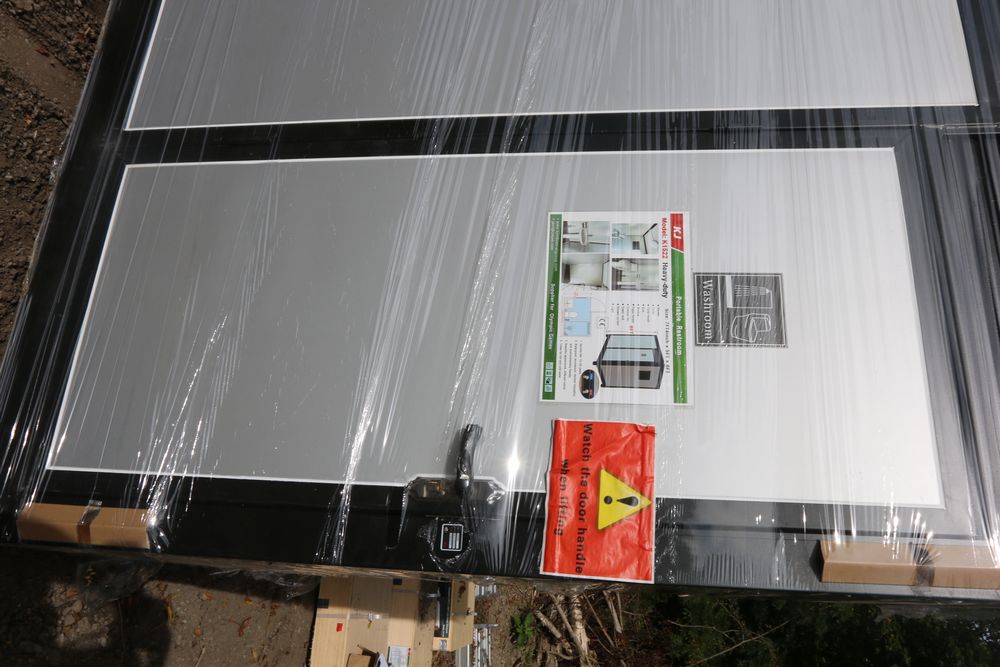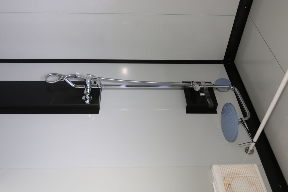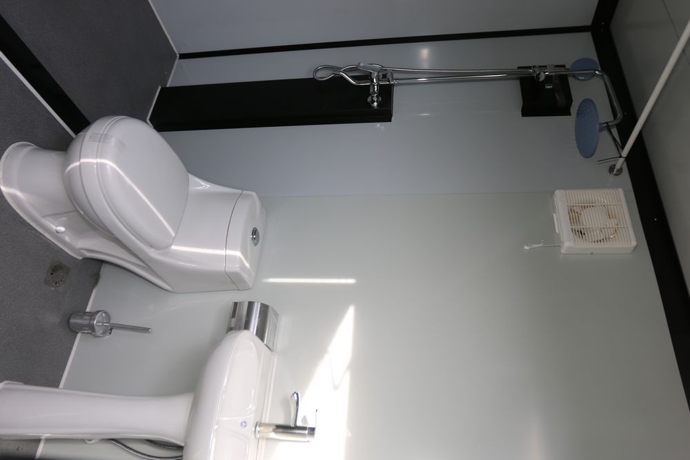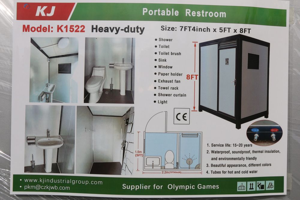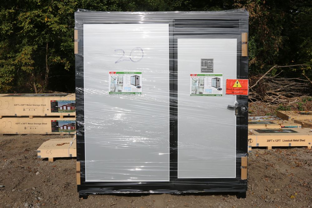 New 2025 portable restroom 7'4" X 5' X 8', includes shower, toilet, toilet brush, sink, window, paper holder, exhaust fan, towel rack, shower curtain, light, model K1522.