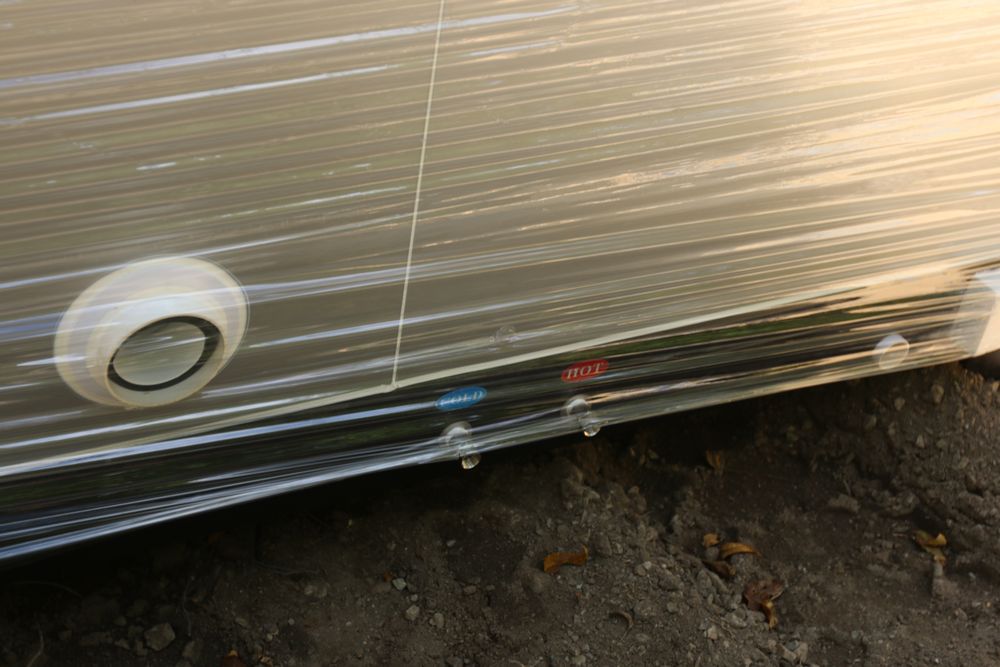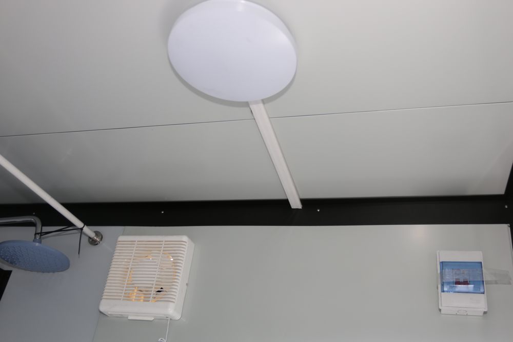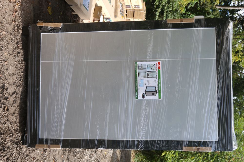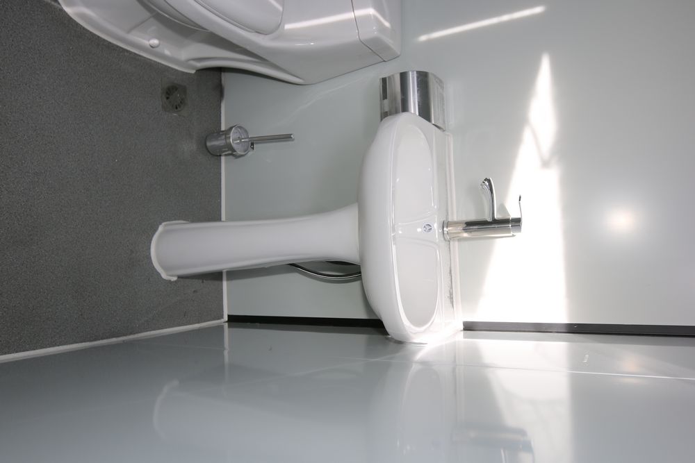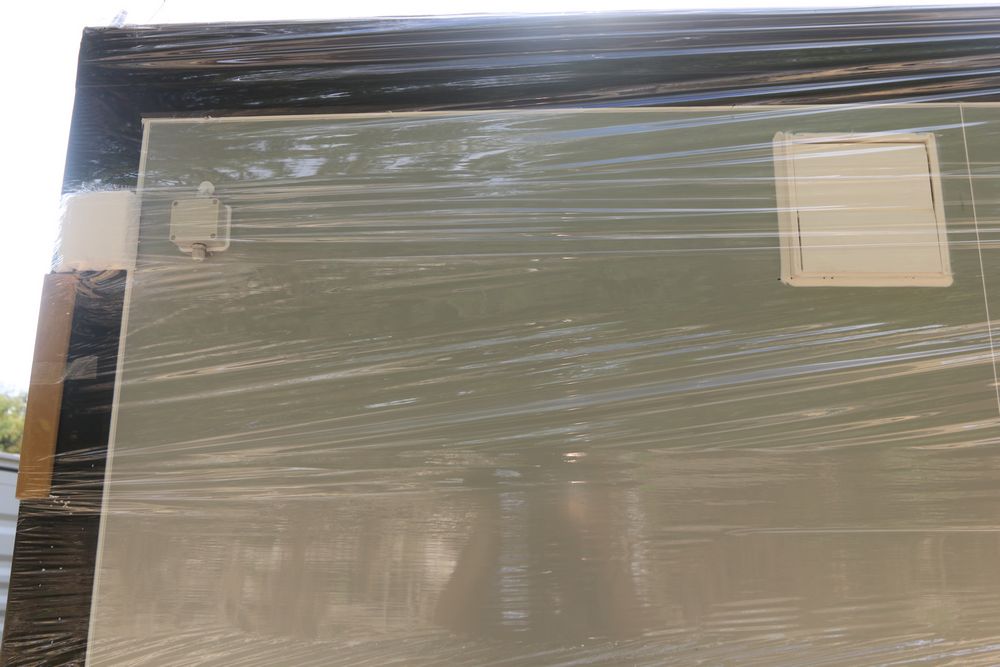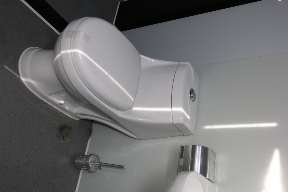 New 2025 portable restroom 7'4" X 5' X 8', includes shower, toilet, toilet brush, sink, window, paper holder, exhaust fan, towel rack, shower curtain, light, model K1522.