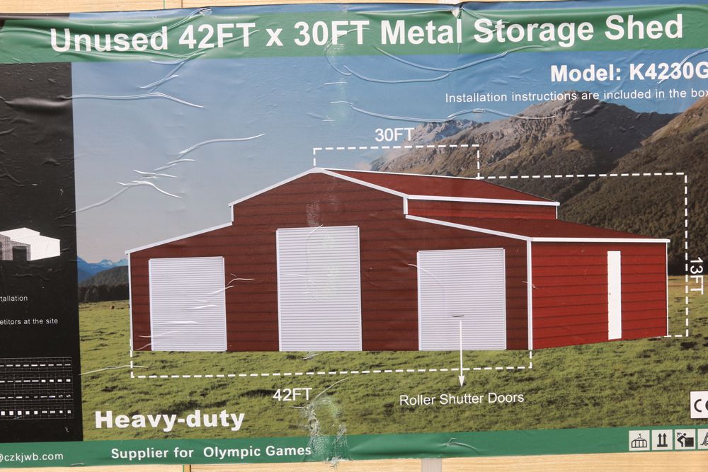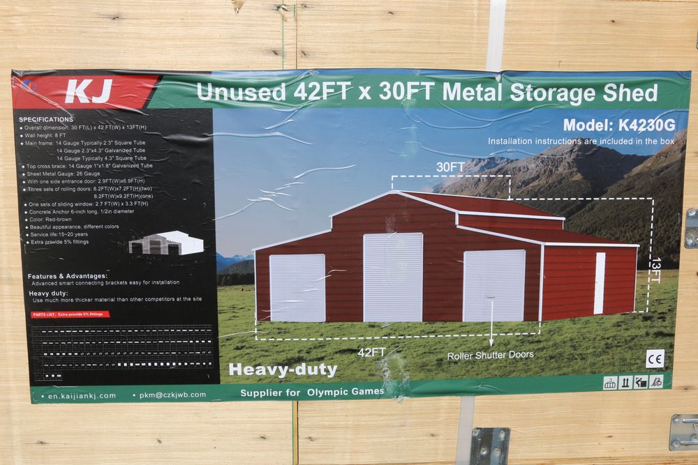 New 2025 Metal Storage Shed 42FT x 30FT Metal Storage Shed model K4230G, in wooden crate.