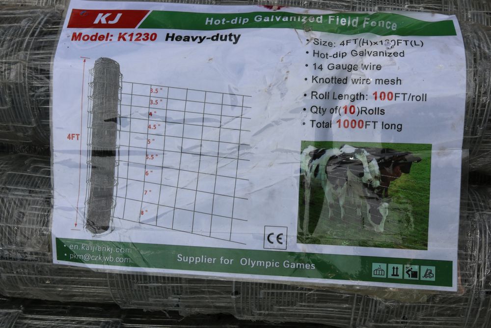 New KJ Hot-dip Galvanized field fence, 4'Tx100'L, 14 gauge wire, 100 feet/roll, 10 rolls total, model K1230.