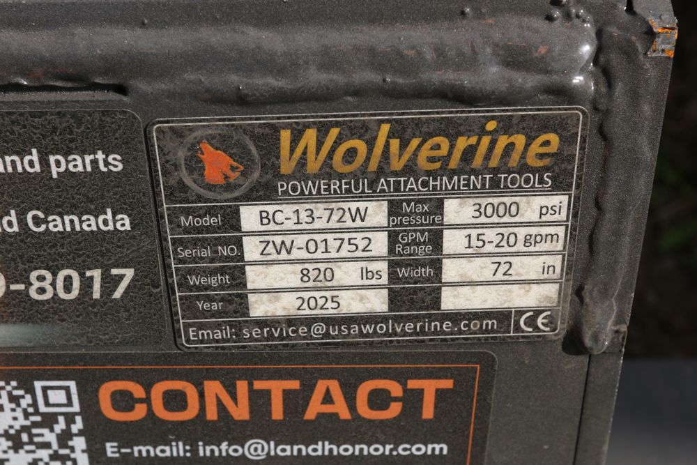 New 2025 Wolverine 72" skid steer brush cutter attachment model BC-13-72W, 66" cutting width, two cutting blades.