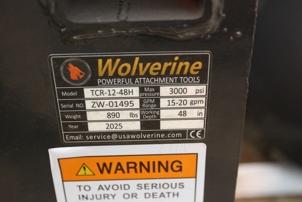 New 2025 Wolverine Skid Steer Trencher attachment model TCR-12-48H, trenching width 8", depth 48", clearing auger dia 15"