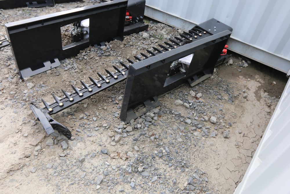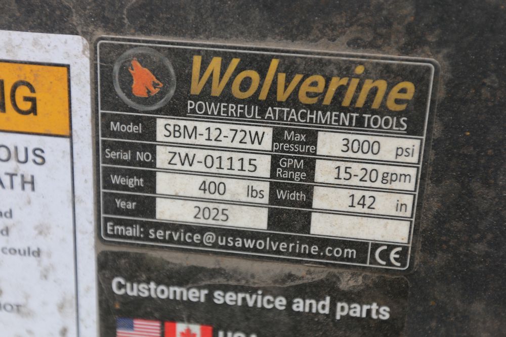 New 2025 Wolverine Skid steer sickle bar mower attachment, model SBM-12-72W, 1" cutting capacity, 72" cutting length, blade swing of +90 degrees -30 degrees.