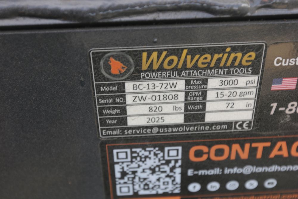 New 2025 Wolverine 72" skid steer brush cutter attachment model BC-13-72W, 66" cutting width, two cutting blades.