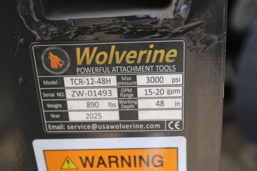 New 2025 Wolverine Skid Steer Trencher attachment model TCR-12-48H, trenching width 8", depth 48", clearing auger dia 15"