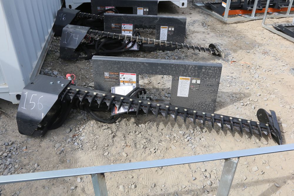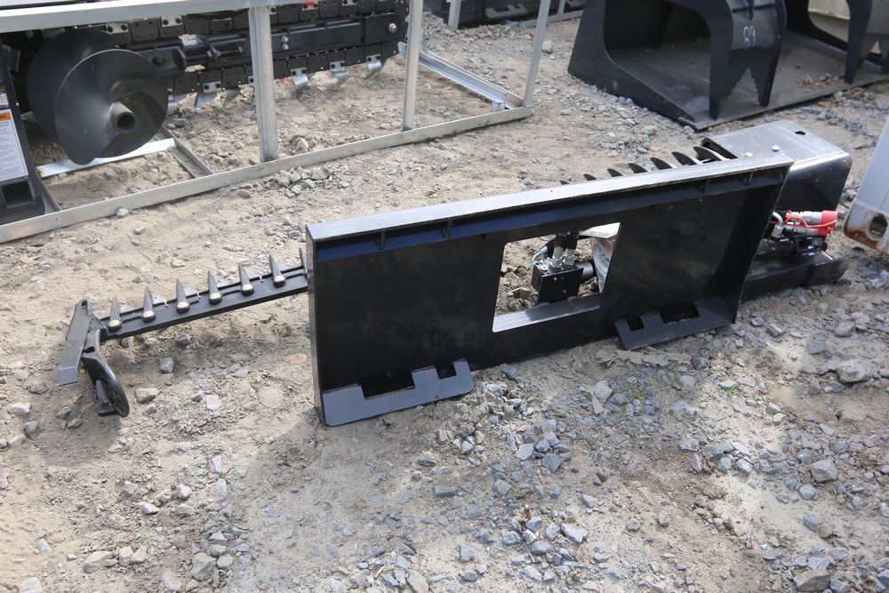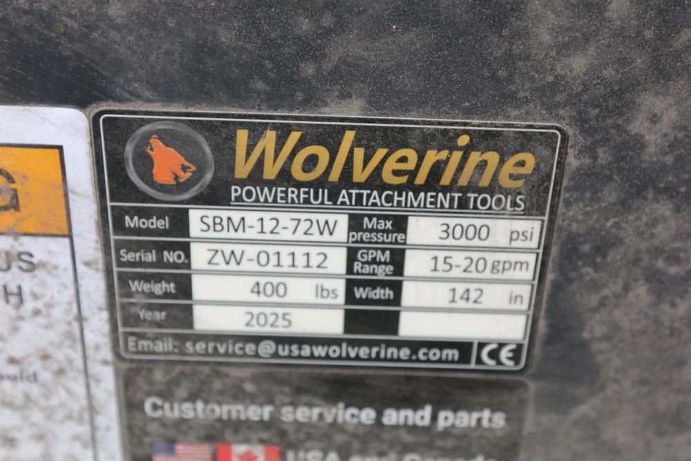 New 2025 Wolverine Skid steer sickle bar mower attachment, model SBM-12-72W, 1" cutting capacity, 72" cutting length, blade swing of +90 degrees -30 degrees.