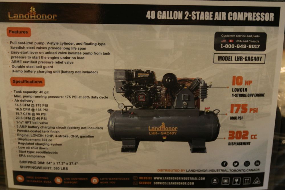 New 2025 Landhonor 40 Gallon 2-Stage Truck Mounted Air Compressor, Briggs & Stratton 10HP, 4-stroke, OHV, gasoline engine, max. pump running pressure: 175 PSI at 80% duty cycle, 1 1/2" NPT Ball Valve, 3 AMP battery charging circuit (battery not included), model: LHR -GAC40Y.