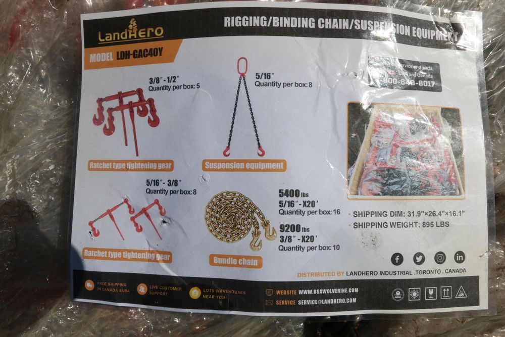 New Landhero rigging, binding chain, and suspension equipment model: LDH-GAC40Y including 10 9200lbs 3/8"x20' chains, 16 5400lbs 5/16"x20' chains, 8 5/16" lifting chains, 5 3/8"-1/2" binders, and 8 5/16"-3/8" binders.
